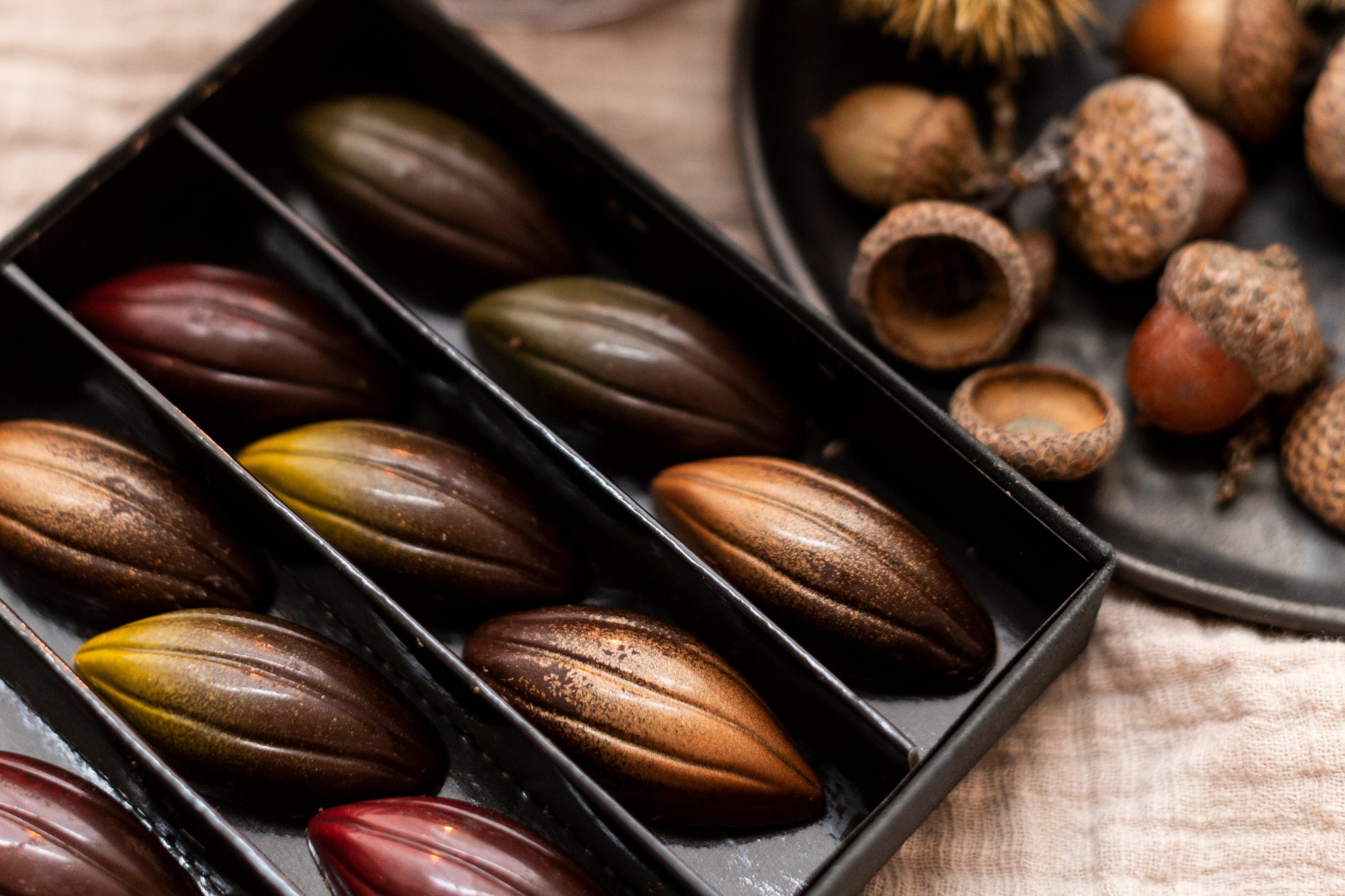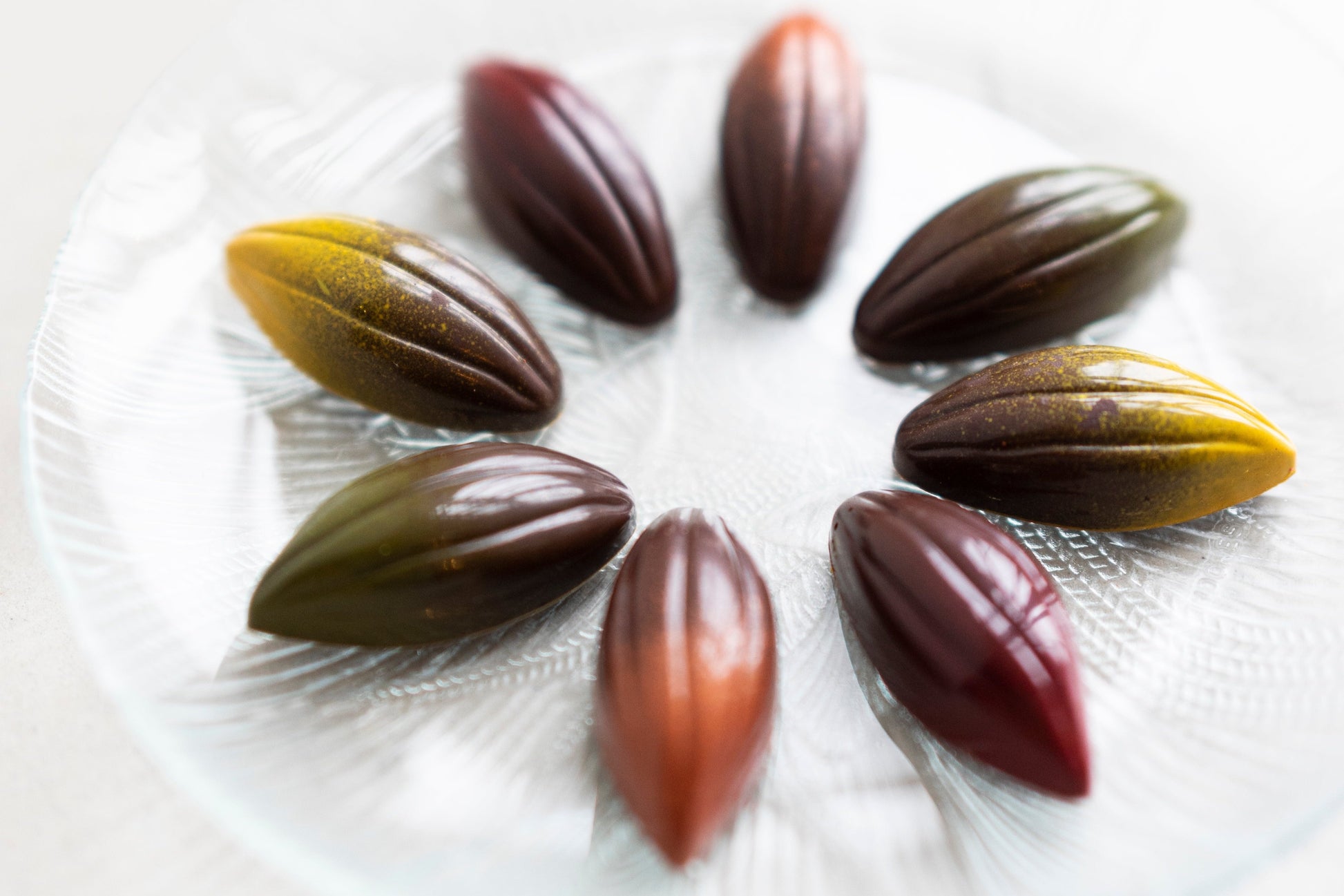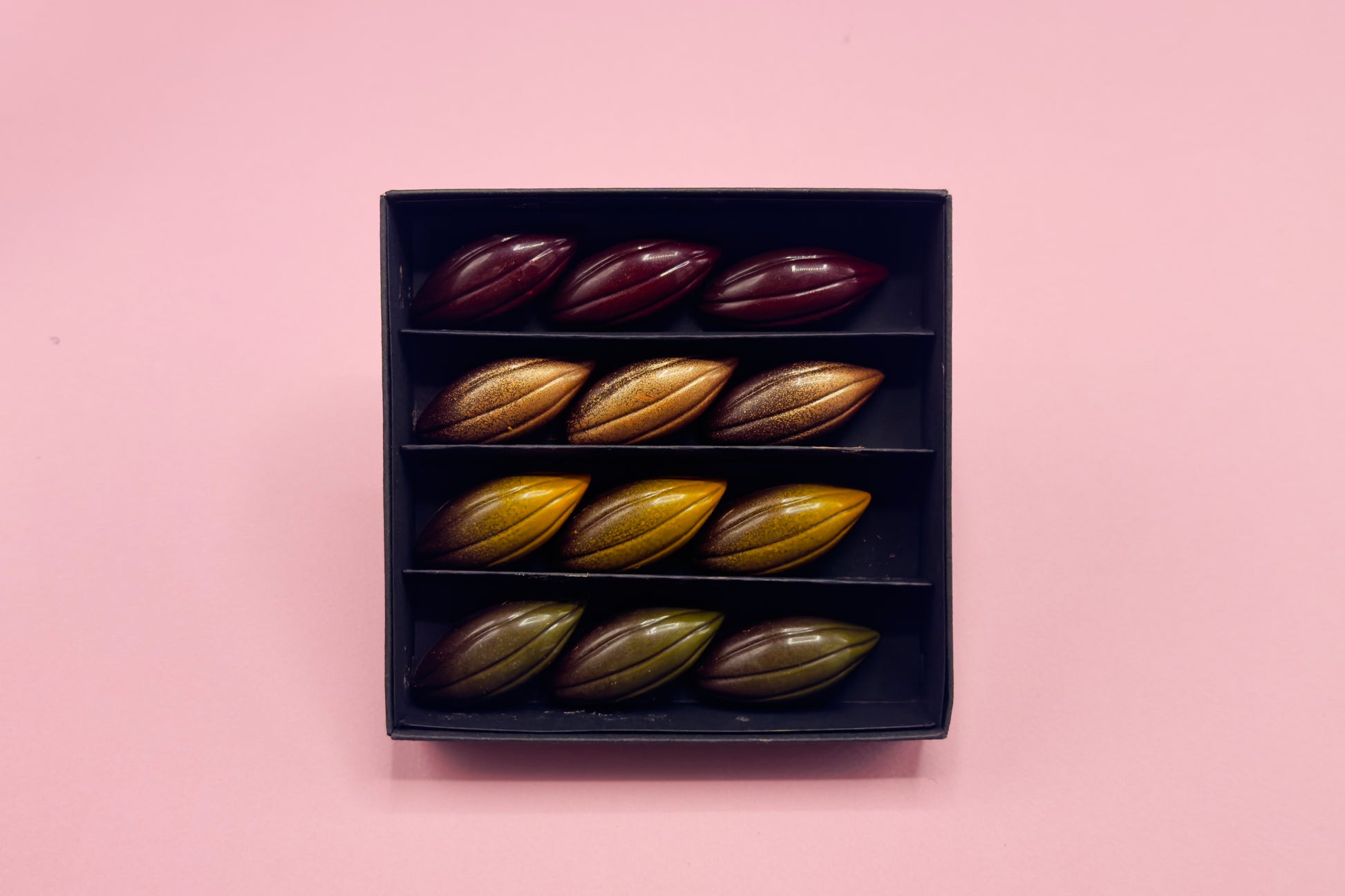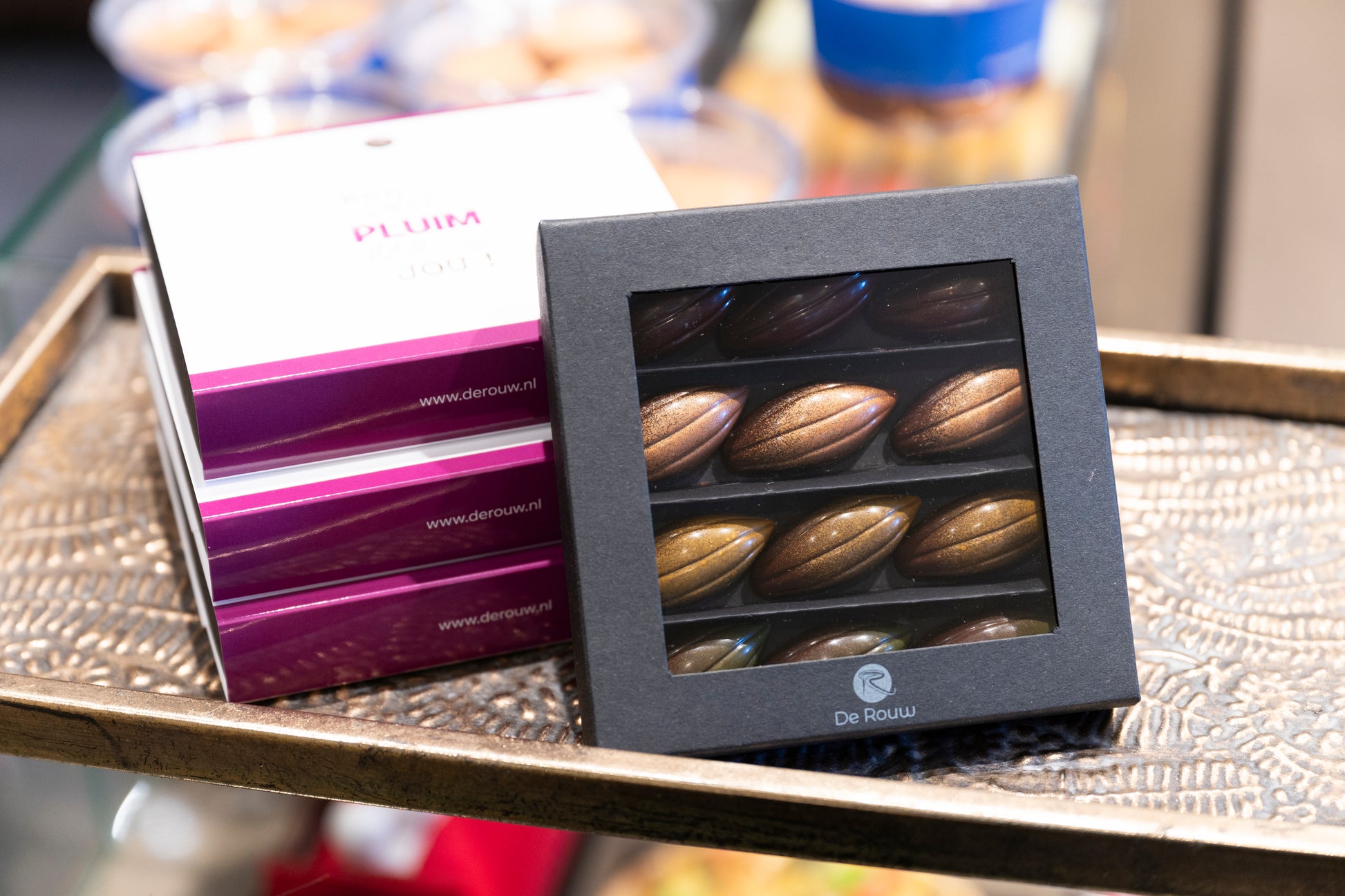 De Vegan bonbons 'Een pluim voor jou!' zijn een verfijnde traktatie voor liefhebbers van luxe chocolade die bewust kiezen voor vegan producten. Deze elegante bonbons zijn vormgegeven als cacaobonen en gevuld met rijke, natuurlijke smaken. Elke bonbon biedt een unieke smaakervaring met een pralinévulling van amandel (groene brush), hazelnoot (rode brush), pinda (geel kleuraccent), en pecan (brons). Ze zijn 100% vegan en gemaakt zonder concessies aan smaak of kwaliteit. Perfect als cadeautje of als eigen verwenmoment. Deze bonbons zijn een subtiele manier om te zeggen: ‘Een pluim voor jou!’ met een heerlijke, plantaardige twist.
