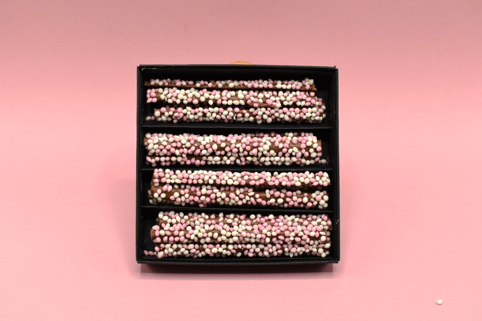 Geef een doos geboortestaafjes cadeau of koop het voor je visite???? Ontzettend lekker en gezellig voor bij de koffie. Heerlijke chocolade met roze en/of blauwe muisjes.