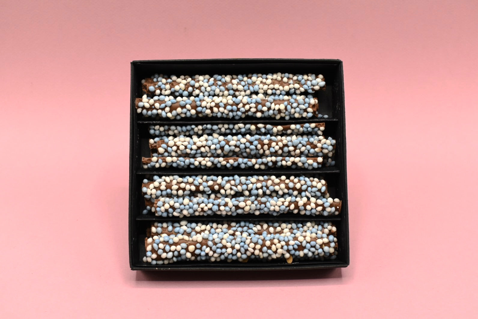 Geef een doos geboortestaafjes cadeau of koop het voor je visite???? Ontzettend lekker en gezellig voor bij de koffie. Heerlijke chocolade met roze en/of blauwe muisjes.