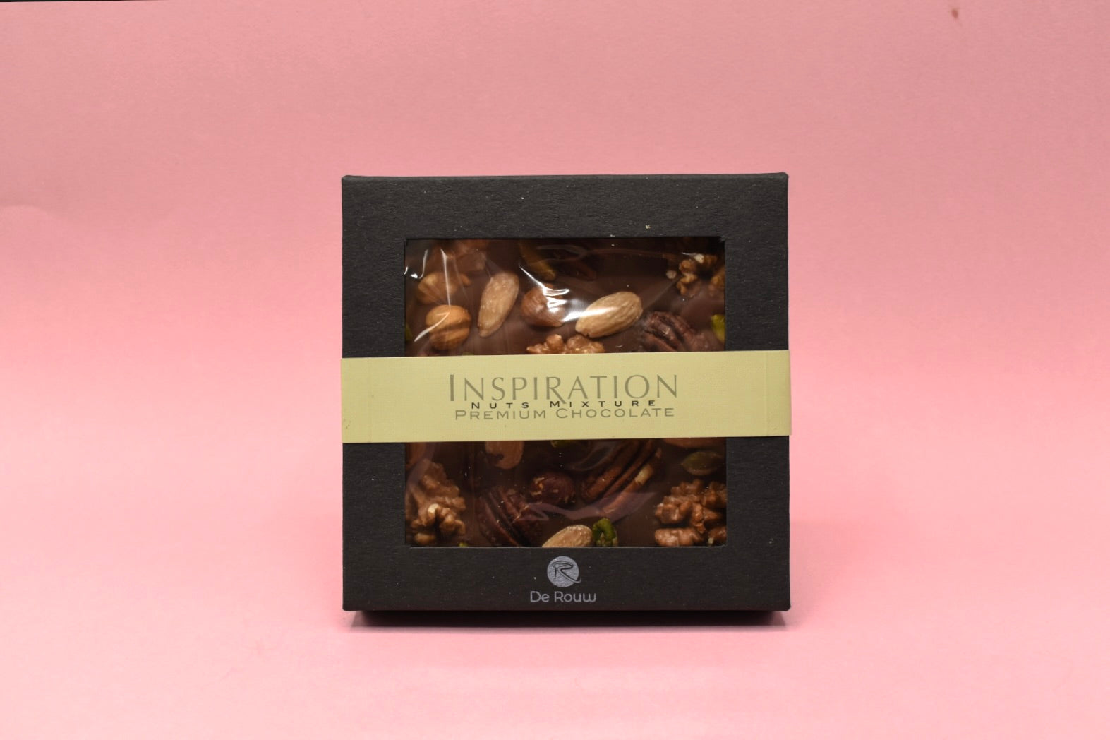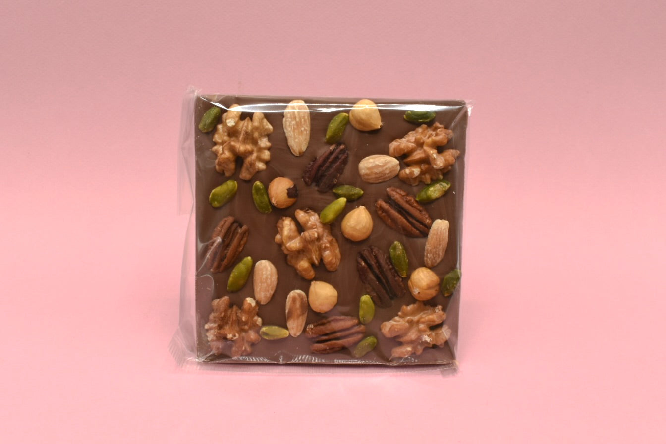 Ingrediënten: suiker, cacaoboter, MELKpoeder, cacaomassa, AMANDELEN, HAZELNOOTstukjes, PECANNOTEN(NOTEN), WALNOTEN, suiker