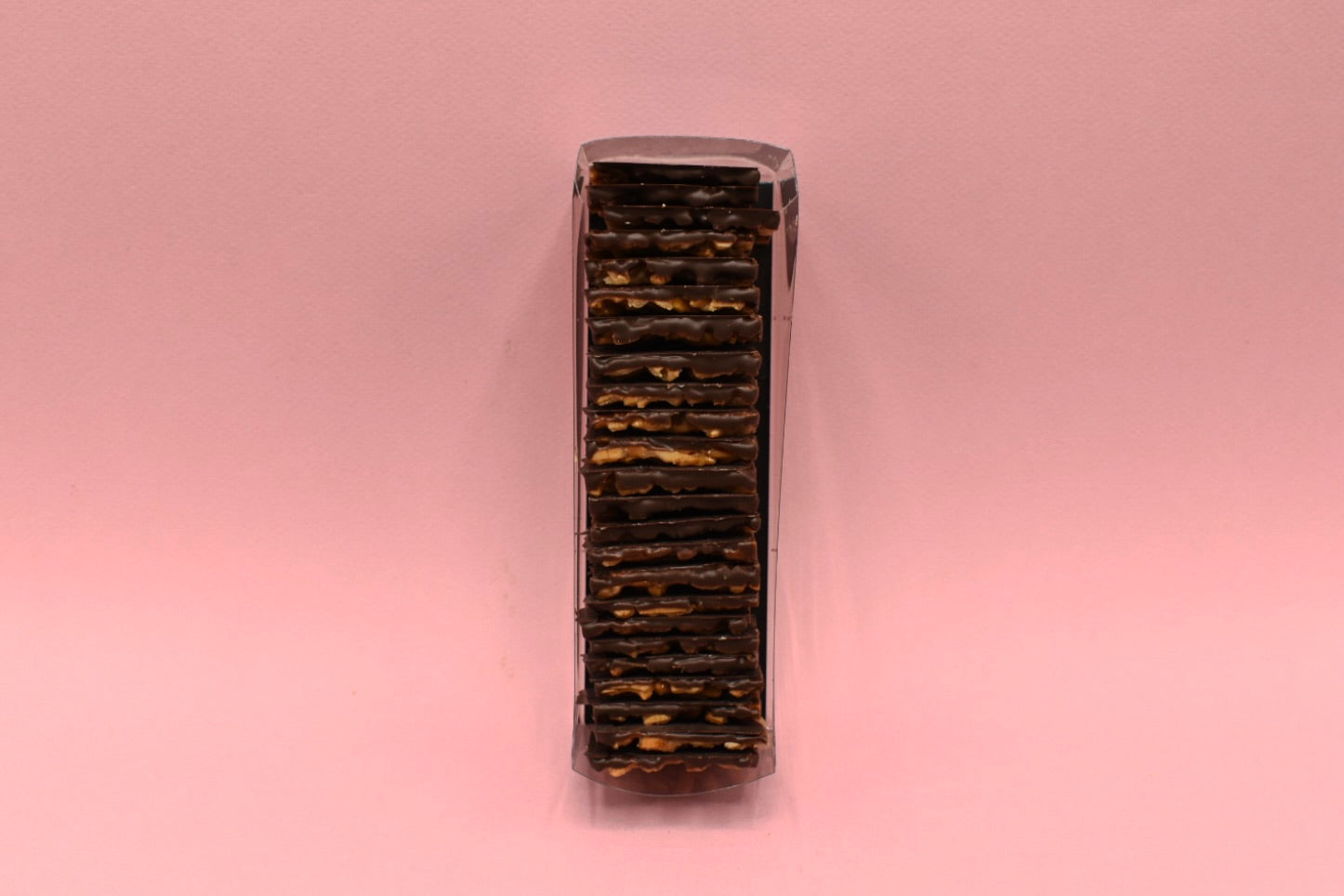 De Carre-Florentines zijn een elegante traktatie die vakmanschap en verfijning uitstraalt. Deze zoete, vierkante koekjes worden gemaakt van knapperige amandel splits, perfect gemengd met gesmolten suiker voor een rijke en krokante textuur. De onderkant van elk koekje is bedekt met een laagje overheerlijke pure chocolade, wat een verfijnde balans van zoet en bitter toevoegt. Deze Florentines zijn ideaal als luxe snack bij koffie of thee, of als een verfijnd cadeau voor de fijnproever. Geniet van de onweerstaanbare smaak en textuur van deze heerlijke Carre-Florentines, die elke zoete gelegenheid bijzonder maken.